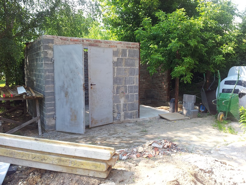 Widok ogólny kojec po wybudowaniu po prawej właściwy kojec do którego jest już kupiona krata z drzwiami, będzie się składał z 2 części betonowej posadzki i pisaku żeby dało się zakopać kości ewentualnie załatwić potrzebę